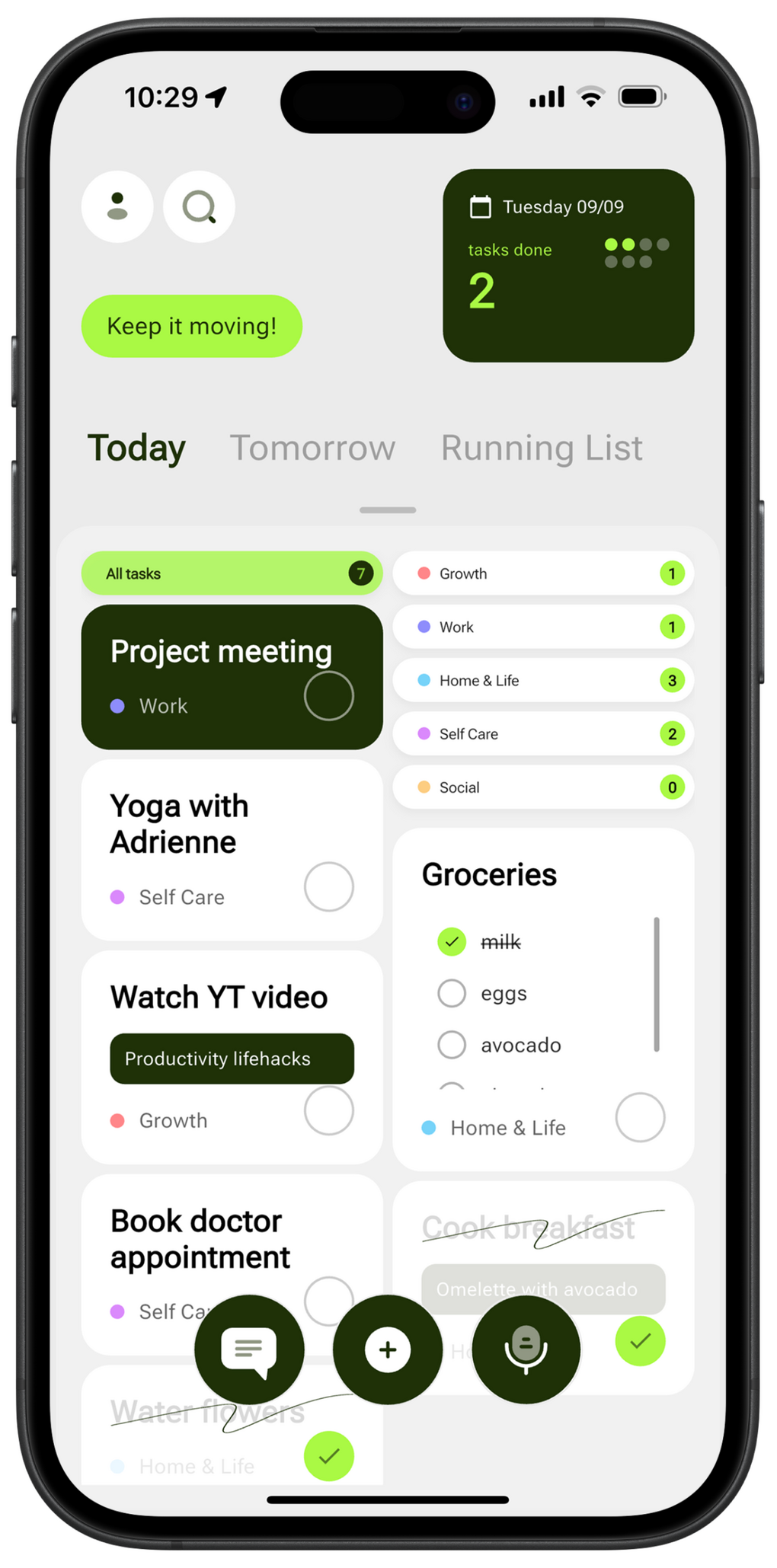 Say it out loud or type it out messy — even a whole paragraph. Thinkii turns your thoughts into neat, ready-to-do tasks. One tap, and your mental load is lighter.